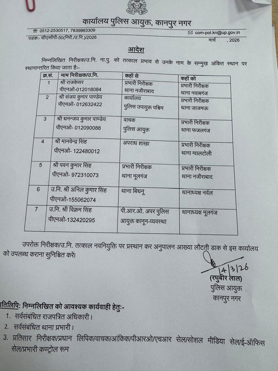 कानपुर पुलिस कमिश्नरेट में बड़ा फेरबदल, कई थानों में नए प्रभारी तैनात।
